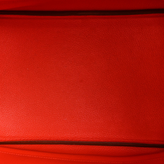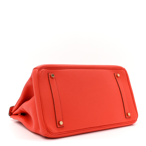This is an authentic HERMES Togo Birkin 35 in Capucine. This stylish handbag is beautifully crafted of togo calfskin leather in bright red with an orange undertone. The bag features rolled leather top handles, a frontal flap and strap closure, gold hardware including strap links and a front turn lock, and a matching clochette for the key. This opens the top flap to a matching leather interior with pockets.