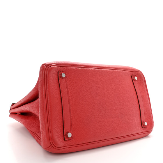 This is an authentic HERMES Togo Birkin 35 in Vermillon. This handbag is crafted of luxurious togo calfskin leather in red. It features rolled leather top handles, a cross-over flap and a strap closure with a gold turn lock. This opens to a spacious matte chevre goatskin leather interior with zipper and pockets.