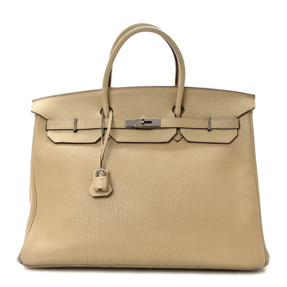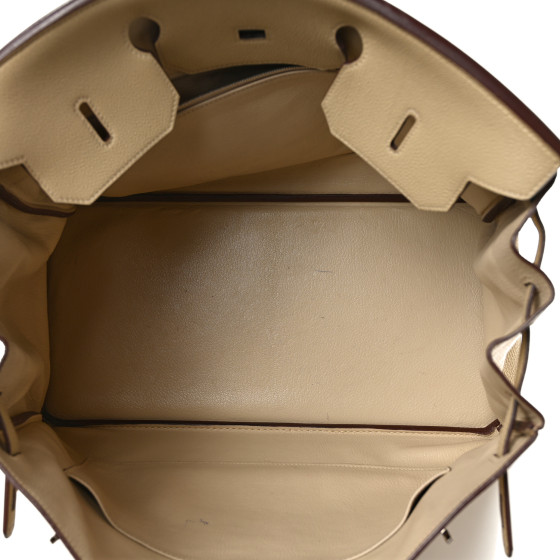 This is an authentic HERMES Togo Birkin 40 in Trench. This stylish tote is crafted of togo calfskin leather in beige. The bag features rolled leather top handles, a frontal flap and strap closure and polished palladium hardware. The flap opens to a matching leather interior with zipper and patch pockets.