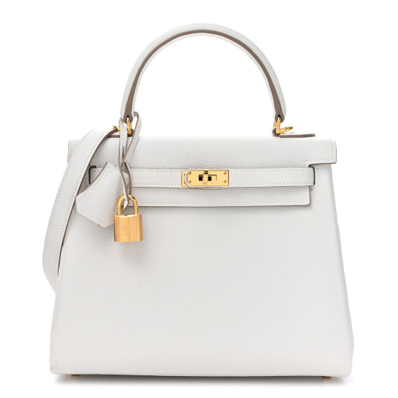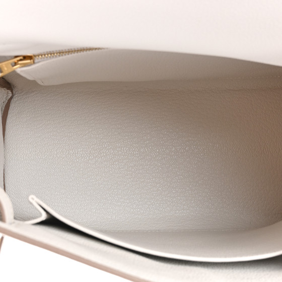 This is an authentic HERMES Togo Kelly Retourne 25 in Gris Pale. This chic and iconic handbag is expertly handcrafted of grained calfskin leather in light grey. The bag features rolled leather top handles, a short front flap with a strap closure with gold hardware including a padlock and an optional shoulder strap. The top flap opens to a matching goatskin leather interior with zipper and patch pockets.