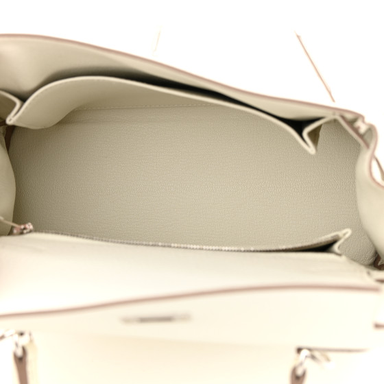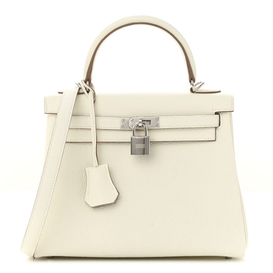 This is an authentic HERMES Togo Kelly Retourne 25 in Mushroom. This chic and iconic handbag is expertly handcrafted of grained calfskin leather in off white. The bag features rolled leather top handles, a short front flap with a strap closure with gold plated hardware including a padlock and leather covered keys, as well as an optional shoulder strap. The top flap opens to a matching goatskin leather interior with zipper and patch pockets.