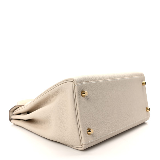 This is an HERMES Togo Kelly Retourne 28 in Craie. This stylish Kelly handbag classic is crafted of beautifully textured calfskin leather in ivory. The bag features a leather clasp top handle, an optional shoulder strap, a cross over flap with a strap closure and a signature Kelly gold plated turn lock. These open to a matching chevre goatskin leather interior with zipper and patch pockets.