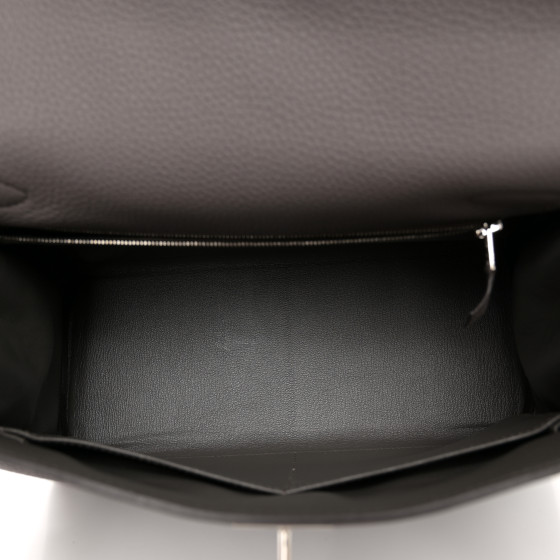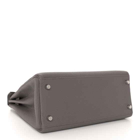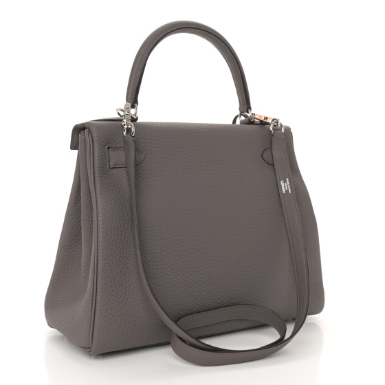 This is an authentic HERMES Togo Kelly Retourne 28 in Etain. This chic and iconic handbag is expertly handcrafted of grained calfskin leather in gray. The bag features rolled leather top handles, a short front flap with a strap closure with palladium hardware including a padlock and leather covered keys, as well as an optional shoulder strap. The top flap opens to a goatskin leather interior with zipper and patch pockets.