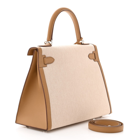This is an authentic HERMES Toile Swift Kelly Sellier 28 in Ecru and Biscuit. This stunning Hermes classic handbag is beautifully crafted in dark beige and white. A single rolled leather top handle is secured with silver palladium plated hardware and an optional leather shoulder strap is included. The traditional Kelly turn-lock secures the small flap. The interior features a matching dark beige swift leather with a single flat pocket.