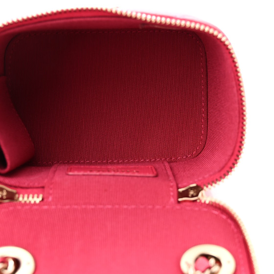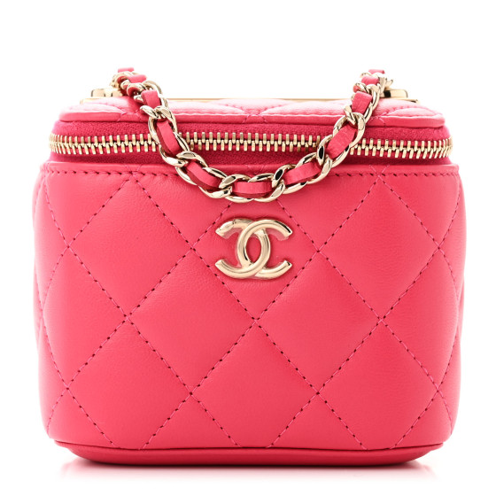 This is an  CHANEL Lambskin Quilted Trendy Mini Vanity Case With Chain in Dark Pink. This stylish crossbody is crafted of luxurious lambskin in pink. The bag features a leather threaded gold chain-link shoulder strap and gold hardware. The handbag features a 3/4 wrap-around zipper that opens to a matching pink fabric interior.