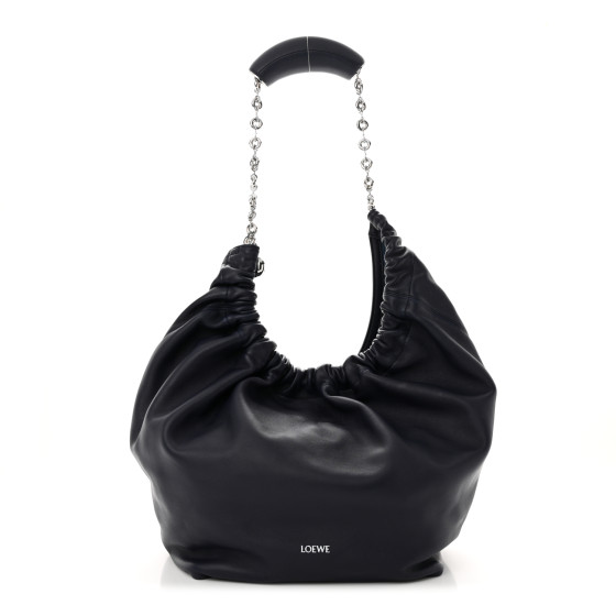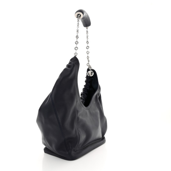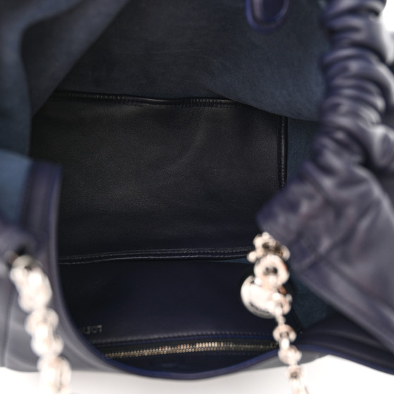 This is an LOEWE Buttery Nappa Lambskin Medium Squeeze Bag in Abyss Blue. This elegant handbag is crafted of ruched smooth lambskin leather in navy blue. The bag features a silver chain strap with a leather shoulder pad, and a silver Anagram engraved charm. The magnetic closure opens to a matching suede interior with a leather zipper pocket.