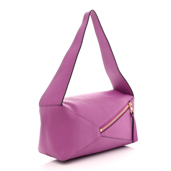 This is an LOEWE Calfskin Puzzle Hobo in Bright Purple. This stunning bag is crafted of smooth calfskin leather in Bright Purple. The bag features a looping leather shoulder strap, a rear zipper pocket, and polished gold hardware. The top zipper opens to a beige fabric interior with a patch pocket.