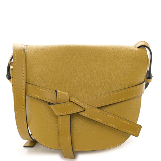 This is an LOEWE Grained Calfskin Small Gate Crossbody Bag in Mustard Yellow. This chic handbag is crafted of grained calfskin leather in yellow. The bag features matching leather trim and shoulder strap with a front knotted detail. The flap opens up to a suede interior with a small patch pocket.