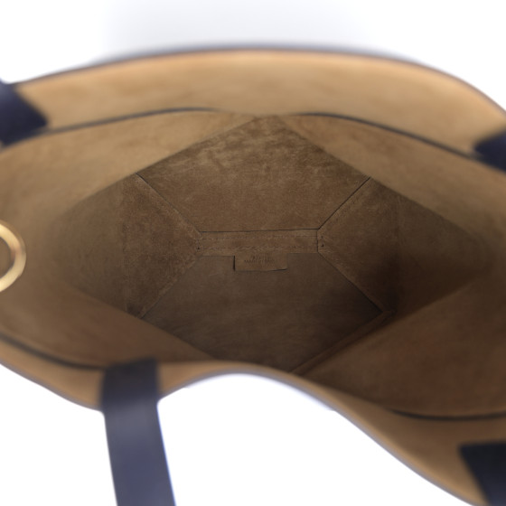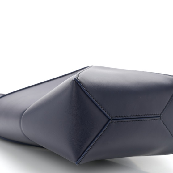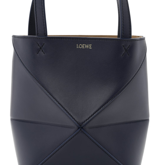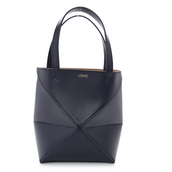 This is an  LOEWE Shiny Calfskin Mini Puzzle Fold Tote in Navy. This chic shoulder bag is crafted of smooth calfskin leather in dark blue. It features leather handles, an optional leather shoulder strap and the the ability to be folded flat. The bag has an open top and a beige suede interior.