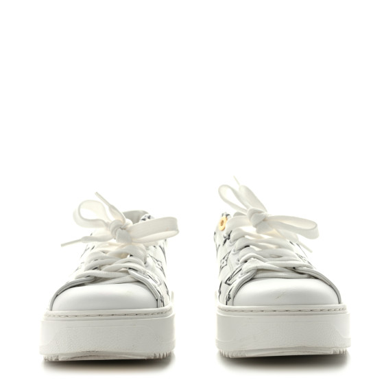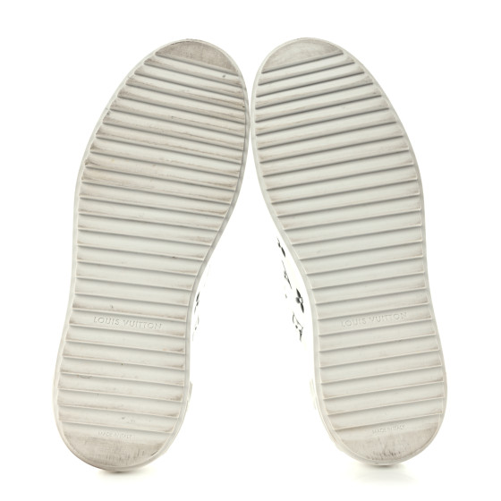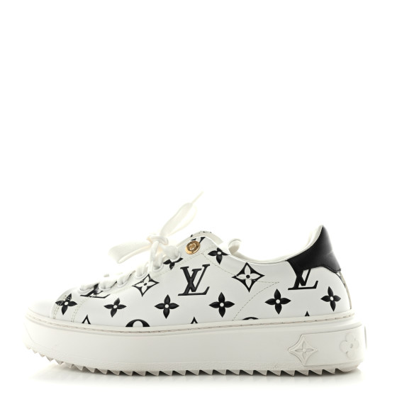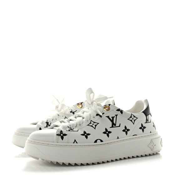This is an pair of LOUIS VUITTON Monogram Time Out Sneakers Size 38 in Black. These stylish sneakers are crafted of white leather with black LV monogramming throughout. They feature sturdy white rubber soles and a black leather heel cap.