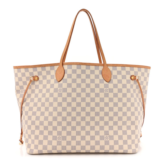 This is an LOUIS VUITTON Damier Azur Neo Neverfull GM in Rose Ballerine. This tote is crafted of signature Louis Vuitton Damier canvas in blue and white. This shoulder bag features vachetta cowhide leather trim including straps and side cinch-cords with polished gold tone hardware. The top is open to a pink striped fabric interior with a hanging zipper pocket.