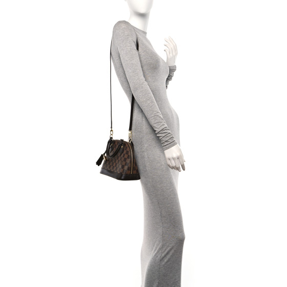 This is an LOUIS VUITTON Damier Ebene Alma BB. This mini bowling-style handbag is crafted of Louis Vuitton’s signature Damier coated canvas in brown. The bag features beautiful brown cowhide leather trim including a solid base, rolled top handles, an optional shoulder strap, and brass hardware. The wrap-around zippers open to a red fabric interior with a patch pocket.