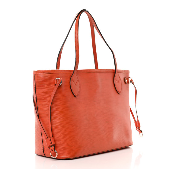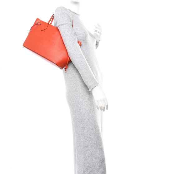 This is an LOUIS VUITTON Epi Neverfull PM in Piment. This stylish tote is crafted of signature Epi textured leather and is in the smallest size in orange. The tote features smooth cowhide leather top strap handles, trim and side cinch cords with polished silver hardware. The wide top is open to a microfiber interior with a matching pochette.