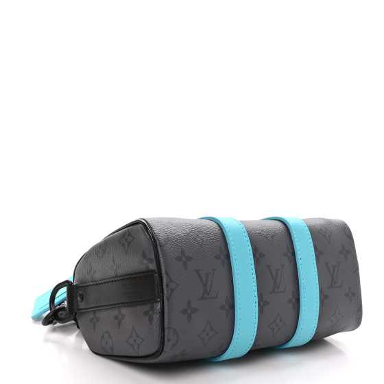 This is an LOUIS VUITTON Reverse Monogram Eclipse Keepall Bandouliere 25 in Turquoise. This chic shoulder bag is crafted of Louis Vuitton monogram canvas in black with gray on the sides. The bag features a black nylon shoulder strap with black hardware. The top zipper opens to a black fabric interior with a patch pocket.