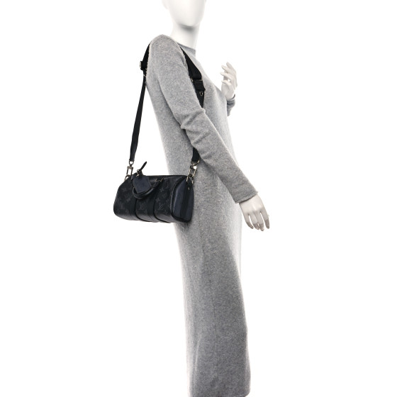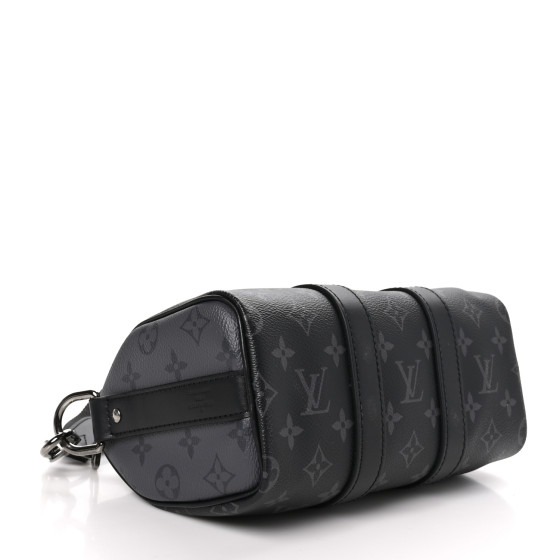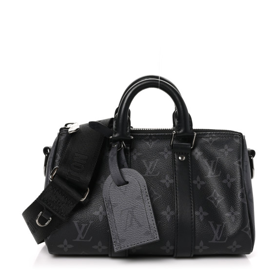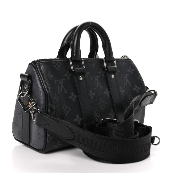 This is an LOUIS VUITTON Reverse Monogram Eclipse Keepall Bandouliere 25. This chic shoulder bag is crafted of Louis Vuitton monogram canvas in black with gray on the sides. The bag features a black nylon shoulder strap with silver hardware. The top zipper opens to a black fabric interior with a pocket.