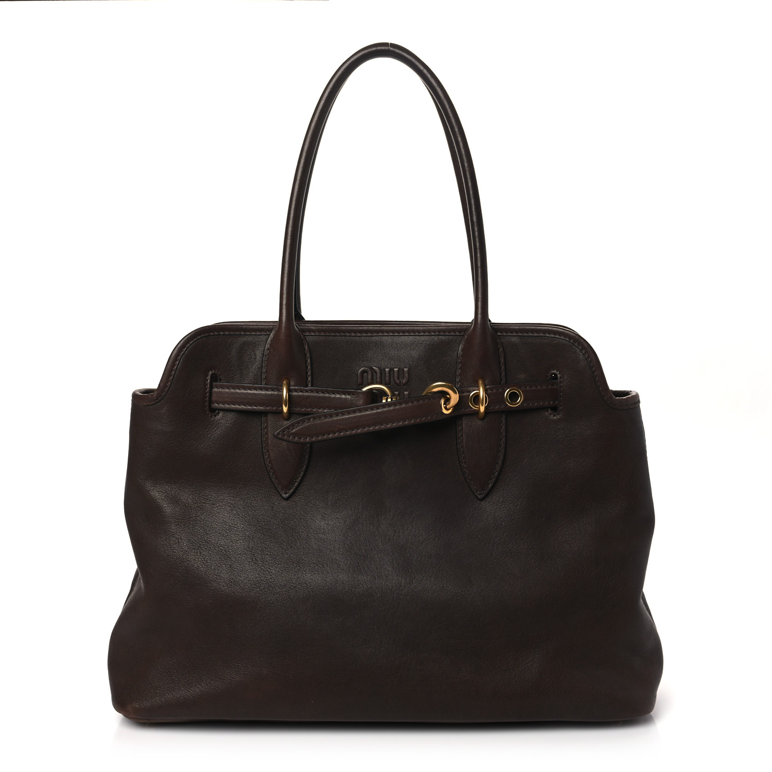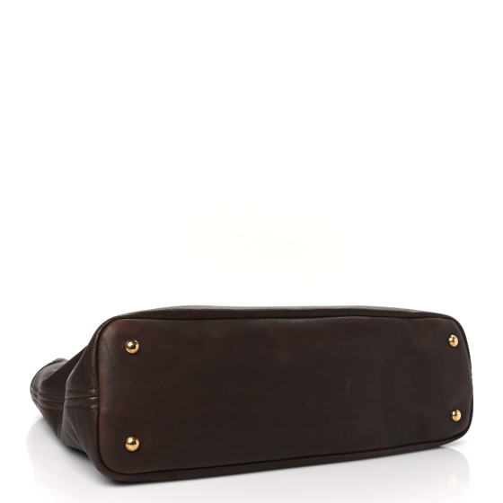 This is an MIU MIU Nappa Adventure Bag in Brown. This stylish bag is crafted of nappa leather in brown. The bag features rolled leather top handles, top cinching strap with a gold clasp, matching hardware, and an embossed Miu Miu logo. The top opens to a beige fabric interior with a zipper pocket and leaths patch pockets.