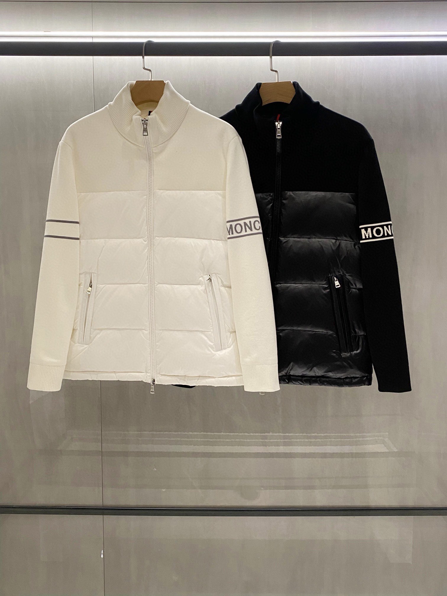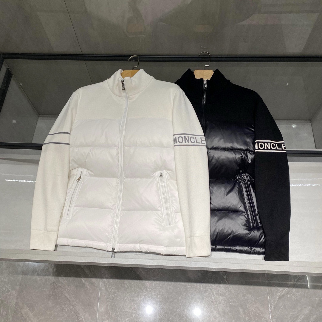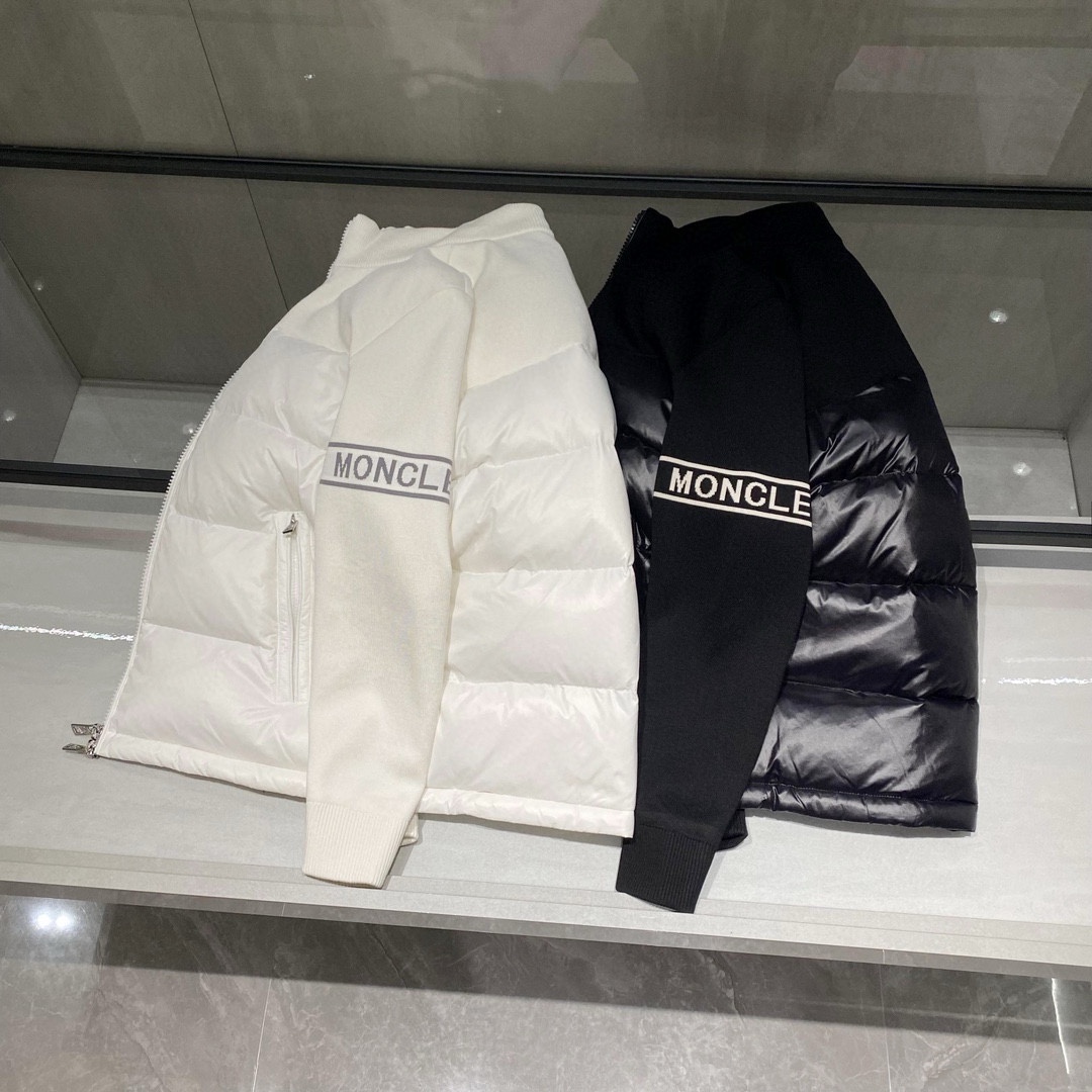 Spliced ??knitted spliced ??down casual jacket!! A very practical one for autumn and winter! The collision of down and knitwear! It has a detailed texture. Whether worn alone or as an inner layer, it is easy to match with a sense of layering. The arm logo inlay embellishment makes the overall sporty and fashionable. The fitted version and the spliced ??down on the chest make the overall three-dimensional sense full while the upper body has no bloated feeling! The design of the sports double zipper placket stand collar and the simple and convenient double-sided oblique zipper pockets are convenient and practical. Two colors are available: black and white. The outer material of the whole garment is spliced ??with knitted wool material, which is full of design sense! The classic armband jacquard embellishment is very eye-catching! 90% down filling, 90% white duck down ~ famously strong! Light and delicate, it is cut with high precision by imported automatic cutting machines to ensure the best down filling accuracy. This alone is a process that ordinary small factories are completely unable to complete! The overall upper body is comfortable and stylish, and it has good warmth retention and breathability