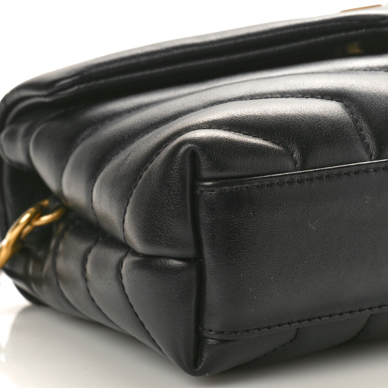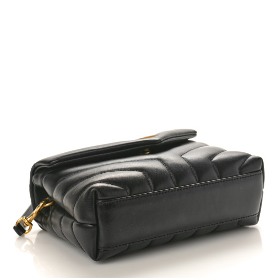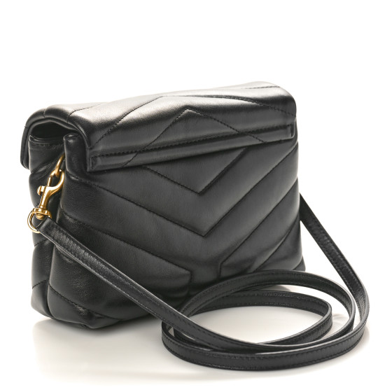 This is an SAINT LAURENT Calfskin Y Quilted Monogram Toy Loulou Crossbody Bag in Black. This chic shoulder bag is crafted of beautiful smooth calfskin leather in black. The crossbody features a shoulder strap with gold hardware. The flap opens to a compact black fabric partitioned interior with a zipper pocket and card slots.