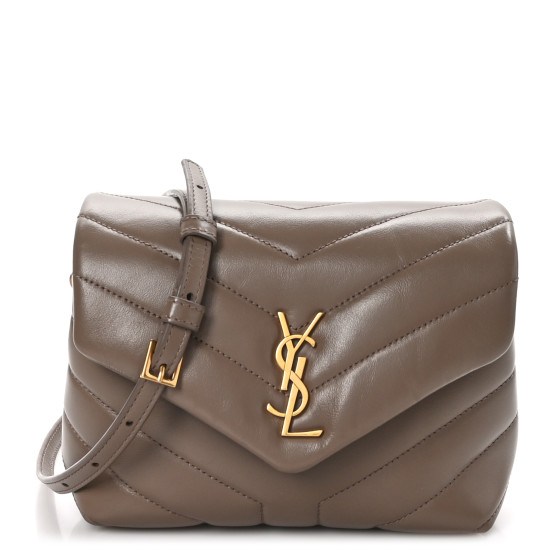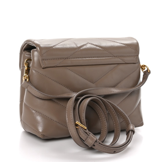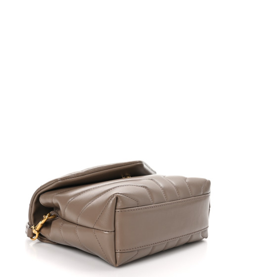This is an SAINT LAURENT Calfskin Y Quilted Monogram Toy Loulou Crossbody Bag in Dark Beige. This elegant shoulder bag is crafted of chic chevron quilted calfskin leather in beige. The bag features a leather shoulder strap and aged gold hardware. The front flap features a prominent gold YSL monogram detail and opens to a partitioned black fabric interior with zipper and patch pockets.