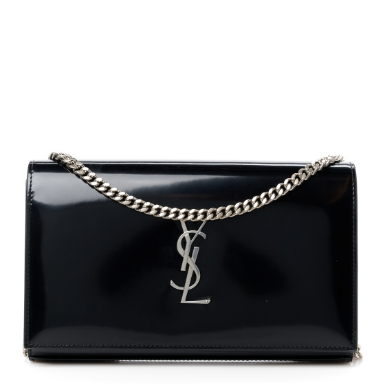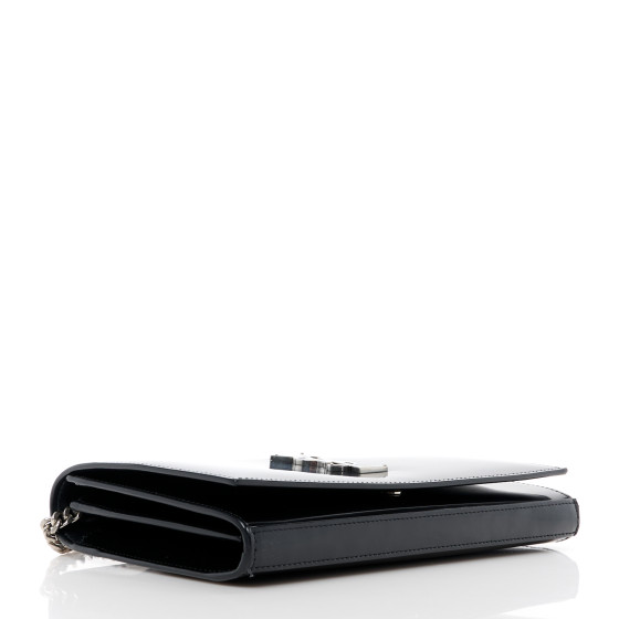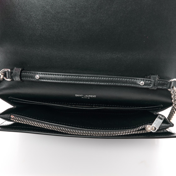 This is an SAINT LAURENT Glazed Calfskin Cassandre Wallet On Chain WOC in Black. This stylish handbag is smooth polished calfskin leather in black. The shoulder bag features a silver chain-link shoulder strap and a full-facing flap with the classic matching YSL logo. The flap opens to a black leather interior with card slots and a zipper compartment.