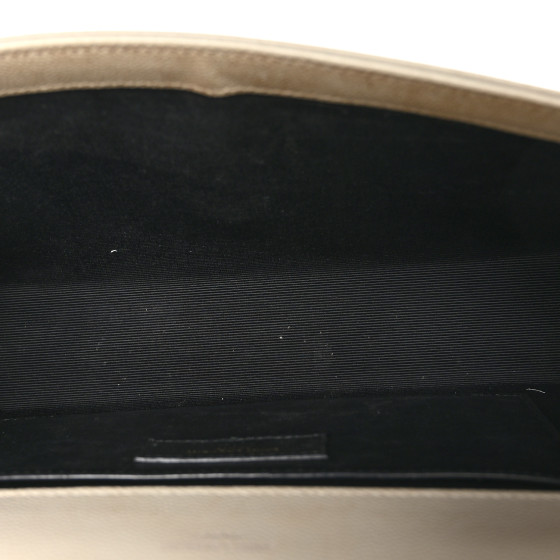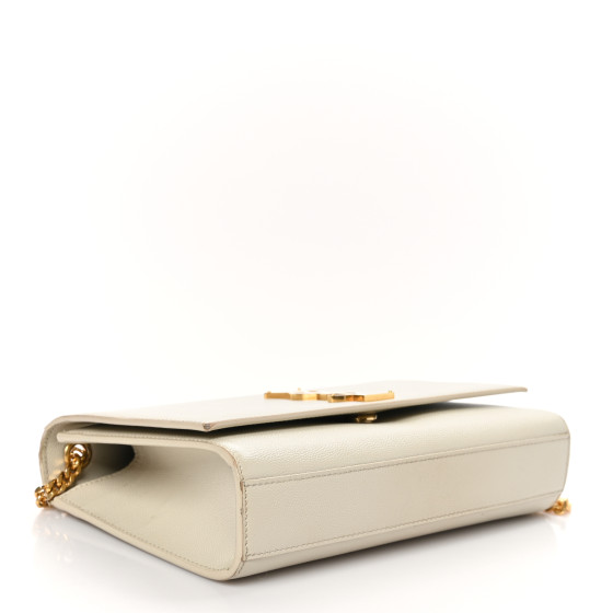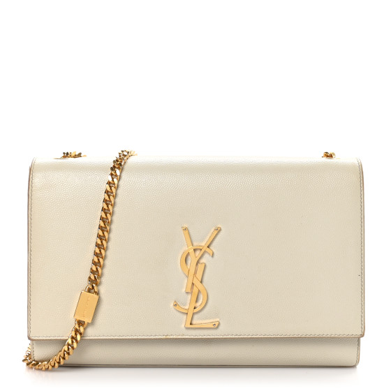 This is an SAINT LAURENT Grain De Poudre Medium Monogram Kate Satchel in Crema Soft. This bag is crafted of pebbled calfskin leather in off-white with gold-toned hardware including a chain shoulder strap and YSL emblem on the front flap. This opens with a magnetic snap to a black fabric interior with a leather patch pocket.