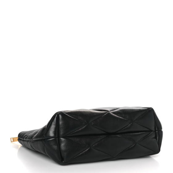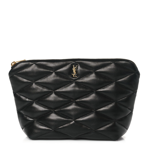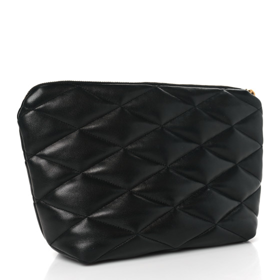 This is an SAINT LAURENT Lambskin Monogram Medium Sade Puffer Pouch in Black. This clutch is crafted of lambskin leather in black with the signature YSL on the front in gold. The front flap opens to a black leather interior with a pocket.
