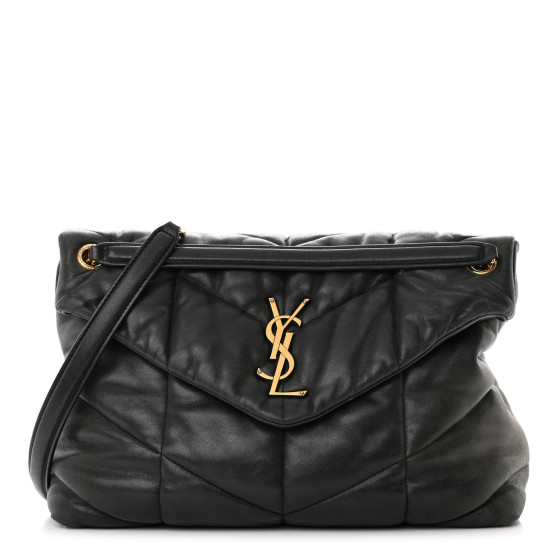This is an  SAINT LAURENT Lambskin Quilted Medium Loulou Puffer Monogram Chain Satchel in Black. This elegant shoulder tote features chic quilted lambskin leather in black. The bag features aged gold chain-link shoulder straps with black leather shoulder pads. The front flap features a prominent aged gold YSL monogram detail and opens to a black fabric interior with a zippered pocket.