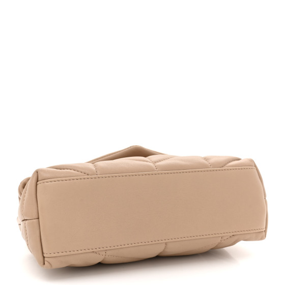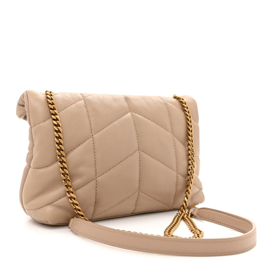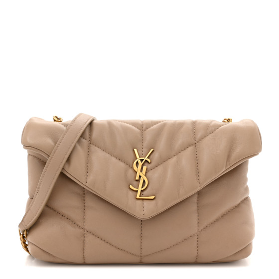 This is an SAINT LAURENT Lambskin Quilted Toy Loulou Puffer Monogram Chain Satchel in Dark Beige. This elegant shoulder bag is crafted of chevron-quilted lambskin leather in beige with a gold chain strap and matching leather shoulder pads. The bag features a front flap with a prominent gold-toned YSL monogram and opens to a black fabric interior with a zippered pocket and leather card slots.
