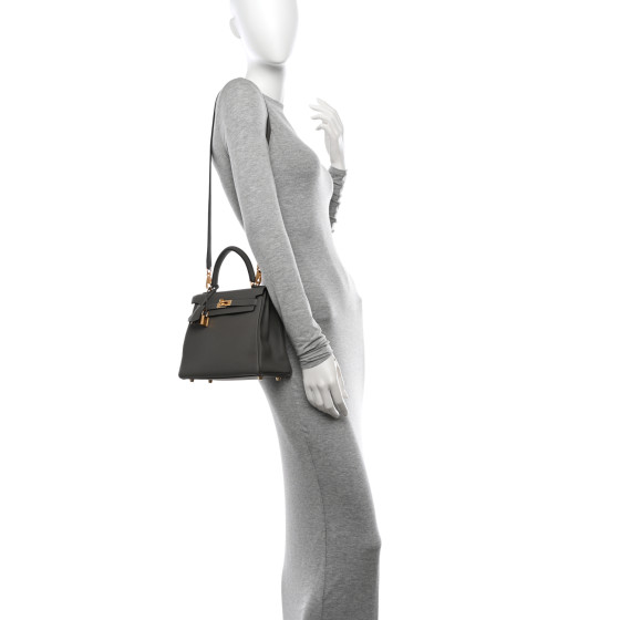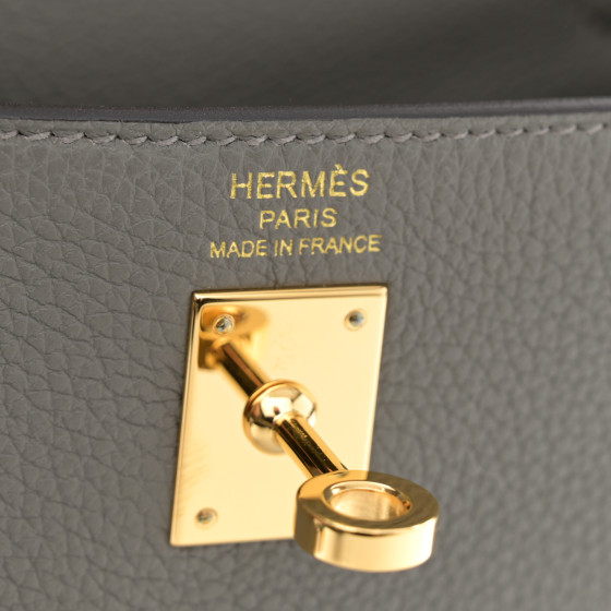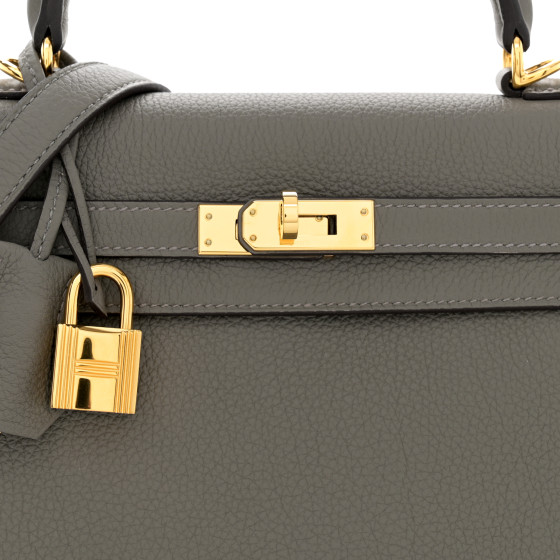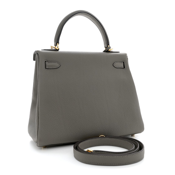 This is an HERMES Togo Kelly Retourne 25 in Gris Meyer. This chic and iconic handbag is expertly handcrafted of grained calfskin leather in grey. The bag features rolled leather top handles, a short front flap with a strap closure with gold hardware including a padlock, leather clochette for the keys and an optional shoulder strap. The top flap opens to a grey goatskin leather interior with zipper and patch pockets.