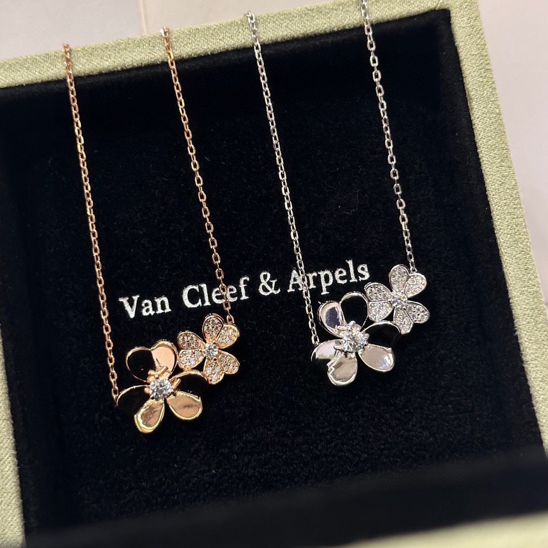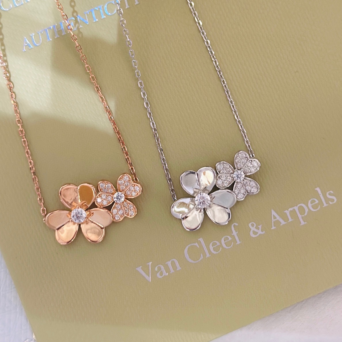 Van Cleef & Arpels Frivole series full diamond polished double flower clover necklace The work is embellished with clever flowers with mirror polished yellow K gold or pavé diamonds, blooming harmonious and brilliant light, making every precious moment dazzling. Selected German imported S925 sterling silver material electroplated with thick gold Super beautiful platinum rose gold two colors optional necklace